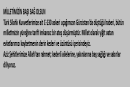 Türk Silahlı Kuvvetlerimize ait C-130 askeri uçağımızın Gürcistan'da düştüğü haberi, bütün milletimizin yüreğine tarifi imkansız bir ateş düşürmüştür. Millet olarak yiğit vatan evlatlarımızı kaybetmenin derin kederi ve üzüntüsü içerisindeyiz.